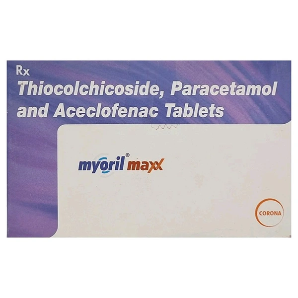 Myoril Maxx Tablet is used to relieve pain and inflammation associated with musculoskeletal and joint disorders. It works by relieving muscle stiffness and blocking chemical messengers that cause pain and inflammation. In some cases, this medicine may cause side effects such as nausea, vomiting, stomach pain, loss of appetite, heartburn, and diarrhoea. Inform the doctor if you are pregnant or breastfeeding, taking any other medication, or have any pre-existing medical conditions.