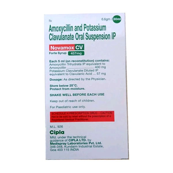 Novamox Cv Forte Syrup is an antibiotic medicine used to treat bacterial infections in children. It is used to treat infections of the skin, throat, ear, and lungs caused by bacteria. A bacterial infection occurs when harmful bacteria enter and grow in the body.