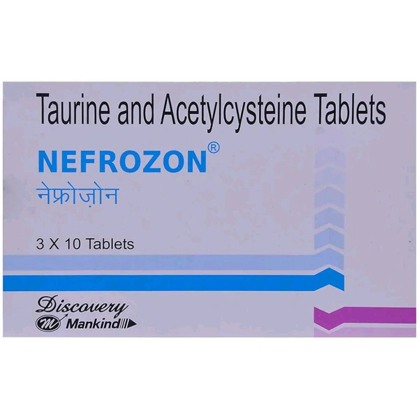 Nefrozon Tablet is used in the treatment of diabetic nephropathy (diabetic kidney disease). It contains Taurine and Acetylcysteine, which can reduce further tissue damage in the kidneys and reduce blood glucose levels. These effects help to control disease progression in diabetic kidney disease. It may cause common side effects such as nausea, vomiting, and rash. Before taking this medicine, you should tell your doctor if you are allergic to any of its components or if you are pregnant/breastfeeding, and about all the medications you are taking and pre-existing medical conditions