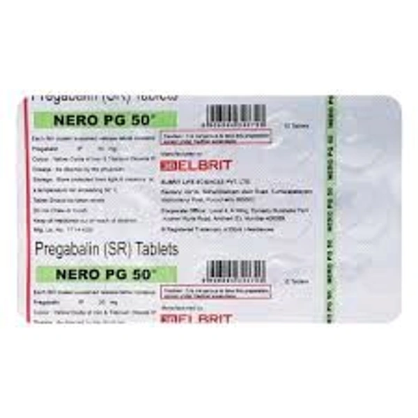Nero PG 50mg Tablet SR is a medicine used to relieve pain caused by nerve damage (neuropathic pain) due to diabetes, shingles (herpes zoster infection), spinal cord injury, or other conditions. It is also used to treat widespread muscle pain and stiffness in people with fibromyalgia.