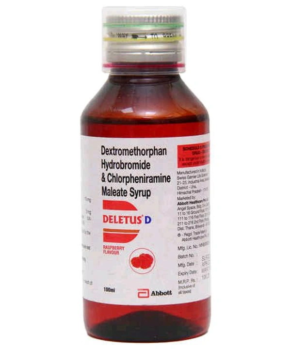 New Deletus D Suger Free Raspberry Syrup is used to treat dry cough. It works by blocking the transmission of nerve signals from the cough centre in the brain to the muscles that produce cough. This medicine may sometimes cause side effects such as dry mouth, throat or nose, drowsiness, blurred vision, constipation, dizziness, and restlessness. Inform the doctor if you are pregnant or breastfeeding, taking any other medication, or have any pre-existing medical conditions.