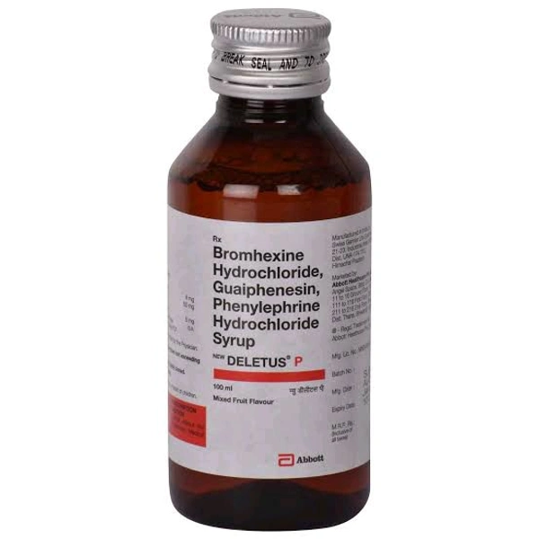 New Deletus P Syrup Mixed Fruit is a combination medicine used in the treatment of cough with mucus. It thins mucus in the nose, windpipe and lungs, making it easier to cough out. It also provides relief from runny nose, sneezing, itching, and watery eyes.