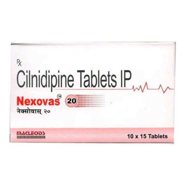 Nexovas 20 Tablet is used for the treatment of hypertension (high blood pressure) and angina (chest pain). It contains Cilnidipine, which acts by relaxing the blood vessels. This reduces the workload on the heart and makes the heart more efficient at pumping blood throughout the body. Thus, it helps to lower high blood pressure, reducing the chances of heart attack or stroke. It may cause common side effects like headache, feeling exhausted and swollen ankles. Before taking this medicine, you should tell your doctor if you are allergic to any of its components or if you are pregnant/breastfeeding, and about all the medications you are taking and pre-existing medical conditions.