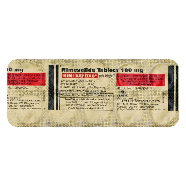 Nimi Rapitab 100 mg Tablet is used to treat pain and dysmenorrhea (painful periods or menstrual cramps). Besides this, it is also used to treat dental pain, which can occur due to damage to the tooth nerve, infection, decay, extraction, or injury. It contains Nimesulide, which works by blocking the effect of a chemical known as prostaglandin, responsible for inducing pain and inflammation in the body. It may cause common side effects like nausea, diarrhoea, changes in liver enzymes, and vomiting. Before taking this medicine, you should tell your doctor if you are allergic to any of its components or if you are pregnant/breastfeeding, and about all the medications you are taking and pre-existing medical conditions.