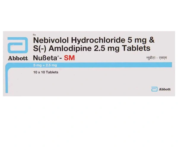 Nubeta-SM Tablet is used to treat high blood pressure and reduce the further risk of heart attack or stroke. It lowers blood pressure and reduces the risk of stroke, heart attack, other heart problems, or kidney problems in the future. It contains S Amlodipine and Nebivolol, which relaxes the blood vessels and reduces the heart's workload, making the heart more efficient at pumping blood throughout the body. Some people may experience headaches, feeling exhausted and swollen ankles. Before taking this medicine, you should tell your doctor if you are allergic to any of its components or if you are pregnant/breastfeeding, and about all the medications you are taking and pre-existing medical conditions.