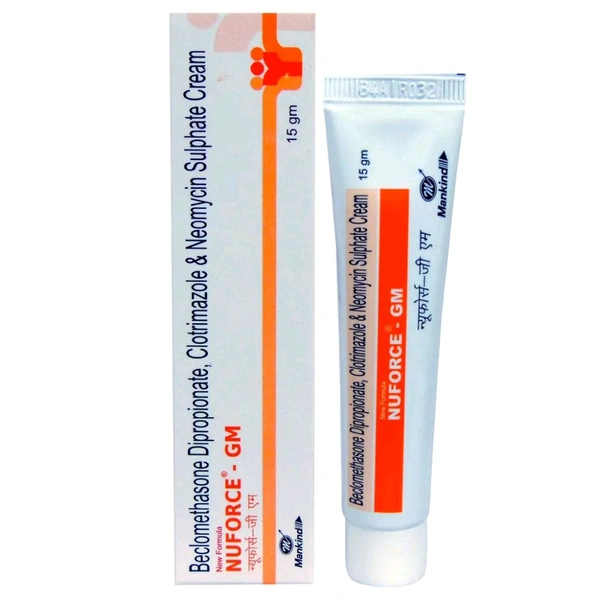 Nuforce-GM Cream is used to treat fungal and bacterial skin infections. It treats skin inflammation due to allergies or irritants, eczema (inflamed, itchy, cracked and rough skin patches), psoriasis (skin cells multiply rapidly to form bumpy/uneven red patches covered with white scales), insect bites and stings. It works by preventing fungal and bacterial growth. Common side effects include itching, redness, dryness, burning and stinging sensation at the site of application. It is an external preparation. Hence avoid contact with eyes, ears, nose and mouth.