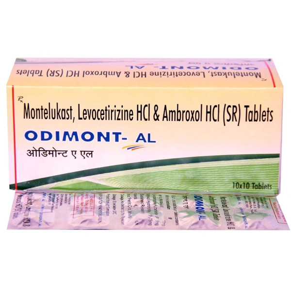 Odimont-AL tablet is a combination medication containing Montelukast (asthma/allergy control), Levocetirizine (antihistamine), and Ambroxol (mucolytic). It is primarily used to treat respiratory disorders linked to thick mucus, such as allergic rhinitis (hay fever), bronchitis, and bronchial asthma, by reducing airway inflammation, loosening mucus, and relieving allergy symptoms like runny nose, sneezing, and chest tightness.