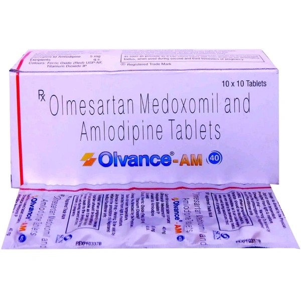 Olvance-AM 40 Tablet is used to treat high blood pressure. It is used alone or in combination with other blood pressure-lowering medications. It contains Olmesartan and Amlodipine, which relaxes blood vessels and allows the blood to flow more smoothly and the heart to pump more efficiently. This reduces the heart's workload. Thus, it helps to lower high blood pressure, reducing heart attack or stroke chances. In some cases, you may experience headaches, drowsiness, ankle swelling, nausea, dizziness, and low blood pressure. Before taking this medicine, you should tell your doctor if you are allergic to any of its components or if you are pregnant/breastfeeding, and about all the medications you are taking and pre-existing medical conditions.