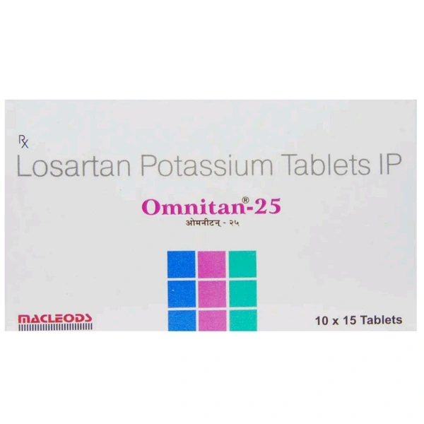 Omnitan 25mg Tablet is used to treat high blood pressure (hypertension), chronic heart failure, and diabetic nephropathy. It is also used to decrease the risk of stroke in people who have high blood pressure and a heart condition called left ventricular hypertrophy (enlargement of the walls of the left side of the heart). It contains Losartan, which works by blocking the action of certain natural substances that tighten the blood vessels, allowing the blood to flow more smoothly and the heart to pump more efficiently. In some cases, you may experience dizziness, tiredness, low blood pressure, weakness, anaemia (lack of blood), hyperkalaemia (high potassium levels in the blood), change in kidney function, orthostatic hypotension (low blood pressure when standing up from lying or sitting position) or hypoglycaemia (low blood sugar).