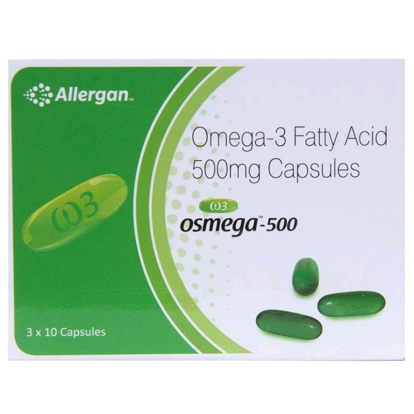 Osmega-500 Capsule is a vitamin supplement used to treat nutritional deficiencies and improve different disease conditions like congestive cardiac failure, coronary artery disease, hypertension, hypercholesterolaemia, eye disorders, premenstrual syndrome, and Alzheimer's disease. This medicine helps in tissue building and repair, has antioxidant properties, provides energy for body functioning, protects cells from harm and promotes metabolism. Common side effects include nausea, vomiting, loss of appetite, stomach upset, dry mouth, and diarrhoea