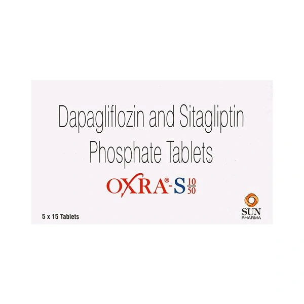 Oxra-S 10/50 Tablet is used to treat type-2 diabetes mellitus. It contains Dapagliflozin and Sitagliptin. Dapagliflozin lowers blood glucose levels and increases glucose excretion in the urine. By improving insulin levels and lowering glucagon levels (the hormone that raises blood glucose levels), sitagliptin decreases the amount of glucose the liver produces. Thus, it helps control blood sugar levels. Common side effects of this medicine include diarrhoea, hypoglycaemia, headache, nausea, and vomiting.