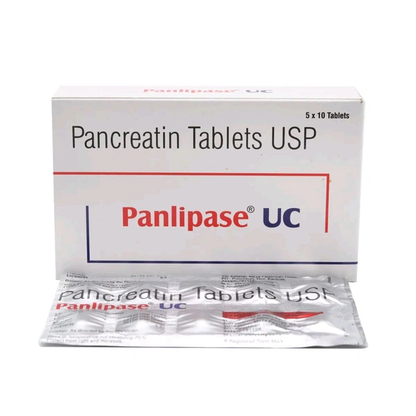 Panlipase UC Tablet is used for the treatment of exocrine pancreatic insufficiency (pancreatin enzyme deficiency) due to cystic fibrosis (an inherited disorder that damages the lungs and digestive system), chronic pancreatitis (inflammation of the pancreas), or other conditions. It contains Pancreatin, which helps in the digestion of food. It mixes thoroughly with the food and aids in digestion as it passes through the gut. In some cases, it may cause certain common side effects such as nausea, mild stomach pain, diarrhoea, and mild skin rash. Before taking this medicine, you should tell your doctor if you are allergic to any of its components or if you are pregnant/breastfeeding, and about all the medications you are taking and pre-existing medical conditions.