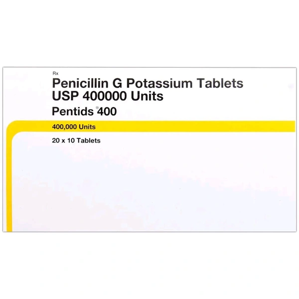 Pentids 400 Tablet is an antibiotic medicine used in the treatment of bacterial infections of the urinary tract, ears, nose, throat, chest, and lungs. This medicine contains penicillin G which works by inhibiting the bacterial cell wall synthesis by binding to the penicillin-binding proteins (PBPs) and thereby helps fight infection-causing bacteria. This medicine is not effective for treating viral infections. Common side effects include stomach pain, headache, nausea, vomiting, diarrhoea, skin rash, yellow-coloured eyes and skin, weakness, etc.
