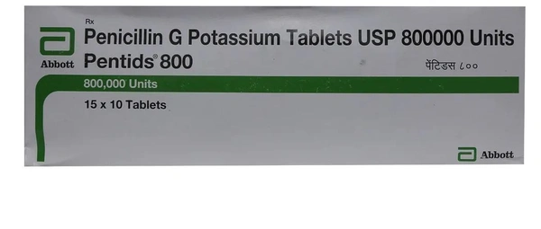 Pentids 800 Tablet is an antibiotic medicine used in the treatment of bacterial infections of the urinary tract, ears, nose, throat, chest, and lungs. This medicine contains penicillin G which works by inhibiting the bacterial cell wall synthesis by binding to the penicillin-binding proteins (PBPs) and thereby helps fight infection-causing bacteria. This medicine is not effective for treating viral infections. Common side effects include stomach pain, headache, nausea, vomiting, diarrhoea, skin rash, yellow-coloured eyes and skin, weakness, etc.