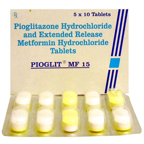 Pioglit MF 15 Tablet is used to treat type 2 diabetes. It contains Pioglitazone and Metformin, which decrease blood sugar by decreasing its formation and increasing its consumption by cells, thereby lowering high blood sugar levels. It is used in adults to treat type 2 (non-insulin-dependent) diabetes mellitus when treatment with metformin alone is not sufficient. Some people may experience side effects such as stomach aches, nausea, vomiting, diarrhoea, loss of appetite, localized swelling (oedema), weight gain, headache, respiratory infection, numbness, taste disturbance, etc. Before taking this medicine, you should tell your doctor if you are allergic to any of its components or if you are pregnant/breastfeeding, and about all the medications you are taking and pre-existing medical conditions.