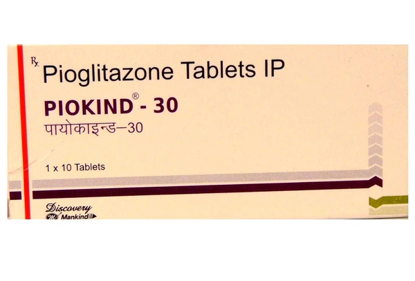 PIOKIND 30MG TABLET is used to treat type 2 (non-insulin-dependent) diabetes mellitus. It contains Pioglitazone, which helps control the sugar level in your blood when you have type 2 diabetes by helping your body make better use of the insulin it produces. It may cause common side effects such as upper respiratory tract infection, headache, sinusitis, myalgia (muscle pain), and pharyngitis. Before taking this medicine, you should tell your doctor if you are allergic to any of its components or if you are pregnant/breastfeeding, and about all the medications you are taking and pre-existing medical conditions
