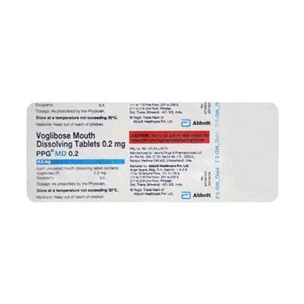 PPG MD 0.2MG TABLET is used to treat type-2 diabetes mellitus when diet and exercise alone cannot control blood sugar levels. It contains Voglibose, which works by inhibiting the intestinal enzymes responsible for breaking complex sugars into simple sugars like glucose. Thereby, it helps in preventing blood glucose levels from rising immediately after meals. In some cases, it may cause common side effects such as abdominal pain, diarrhoea, flatulence (gas), skin reactions, heartburn, nausea, and vomiting. Before taking this medicine, you should tell your doctor if you are allergic to any of its components or if you are pregnant/breastfeeding, and about all the medications you are taking and pre-existing medical condition