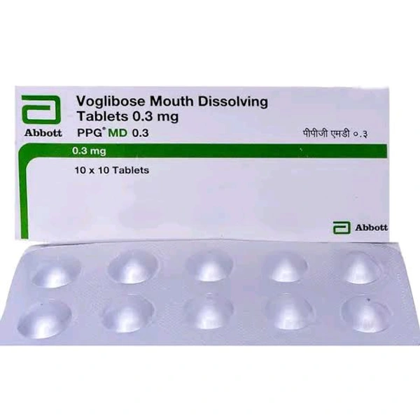 PPG MD 0.3 Tablet is used to treat type-2 diabetes mellitus when diet and exercise alone cannot control blood sugar levels. It contains Voglibose, which works by inhibiting the intestinal enzymes responsible for breaking complex sugars into simple sugars like glucose. Thereby, it helps in preventing blood glucose levels from rising immediately after meals. In some cases, it may cause common side effects such as abdominal pain, diarrhoea, flatulence (gas), skin reactions, heartburn, nausea, and vomiting. Before taking this medicine, you should tell your doctor if you are allergic to any of its components or if you are pregnant/breastfeeding, and about all the medications you are taking and pre-existing medical conditions.