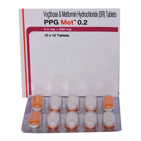 PPG Met 0.2 Tablet is used in the treatment of type 2 diabetes mellitus. It contains Voglibose and Metformin, which acts by inhibiting the intestinal enzymes, which break complex sugars into simple sugars such as glucose. This process prevents the rise of blood glucose levels. Also, it exhibits non-pancreatic effect to reduce serum glucose levels without increasing insulin secretion. It may cause common side effects such as nausea, vomiting, changes in taste, diarrhoea, dizziness, stomach pain, shortness of breath, skin rash, bloating, and flatulence (intestinal wind/gas). Before taking this medicine, you should tell your doctor if you are allergic to any of its components or if you are pregnant/breastfeeding, and about all the medications you are taking and pre-existing medical conditions