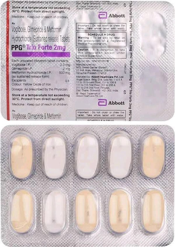 PPG TRIO FORTE 2MG SR TABLET is used to treat type 2 diabetes mellitus. It acts by increasing the amount of insulin released by the pancreas. Thus, prevent the blood glucose levels from rising to very high levels and keeps your diabetes under control. It may cause certain common side effects such as hypoglycaemia (low blood glucose levels), taste change, nausea, diarrhoea, stomach pain, headache, and upper respiratory symptoms. Before taking this medicine, you should tell your doctor if you are allergic to any of its components or if you are pregnant/breastfeeding, and about all the medications you are taking and pre-existing medical conditions.