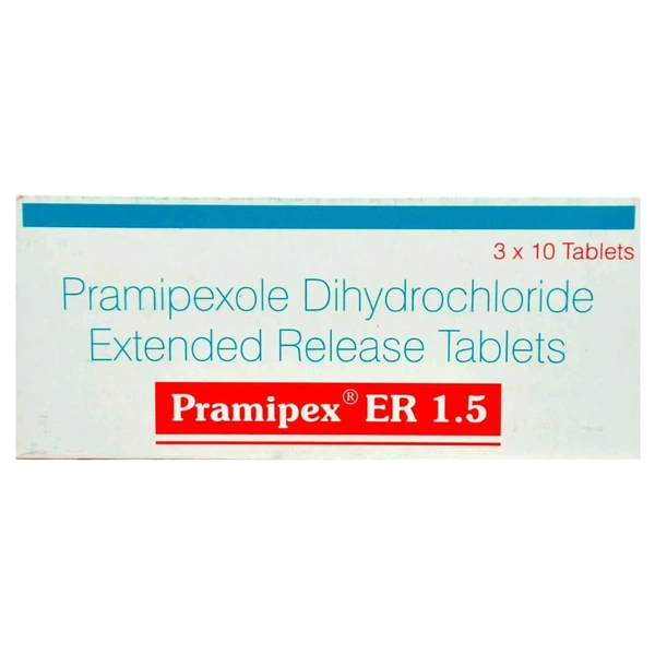 Pramipex ER 1.5 Tablet is used to treat the symptoms of Parkinson's disease and moderate to severe Willis-Ekbom disease (restless legs syndrome) in adults. It contains Pramipexole, which works by mimicking the action of dopamine (acting in place of dopamine), a natural substance found in the brain needed to control body movement. This triggers the nerve impulses in the brain that control body movements. In some cases, you may experience certain common side effects such as sleepiness, nausea, constipation, dizziness, fatigue, hallucinations, dry mouth, muscle spasms, and peripheral oedema (leg swelling due to fluid overload). Before taking this medicine, you should tell your doctor if you are allergic to any of its components or if you are pregnant/breastfeeding, and about all the medications you are taking and pre-existing medical conditions.