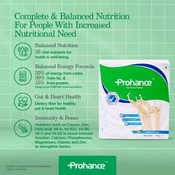 Prohance vanilla Powder is a specially formulated powder that is designed for people with increased nutritional needs. The powder contains a blend of 34 vital nutrients, including high-quality proteins, carbohydrates, and fats, that help to provide nourishment to the body. Additionally, it contains antioxidants and other nutrients that may support overall health and well-being.