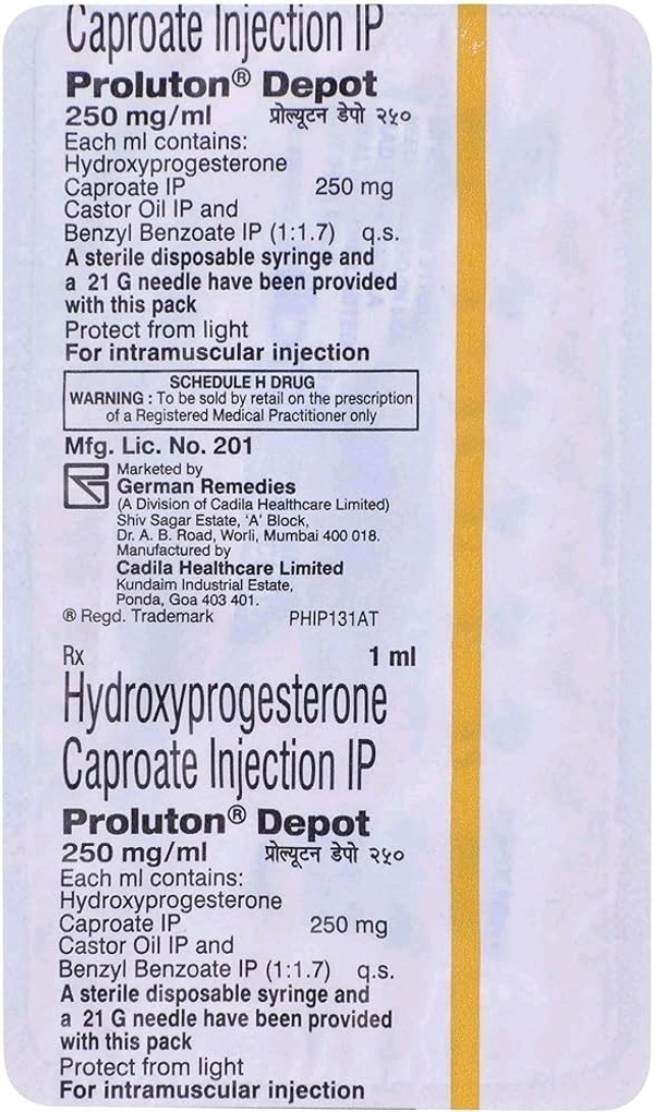 Proluton Depot 250mg/ml Injection is used to prevent premature labor in pregnant women in order to reduce the risk of giving birth too early (preterm birth). It prevents miscarriage and lowers the risk of premature birth in women who have had one premature delivery in the past.