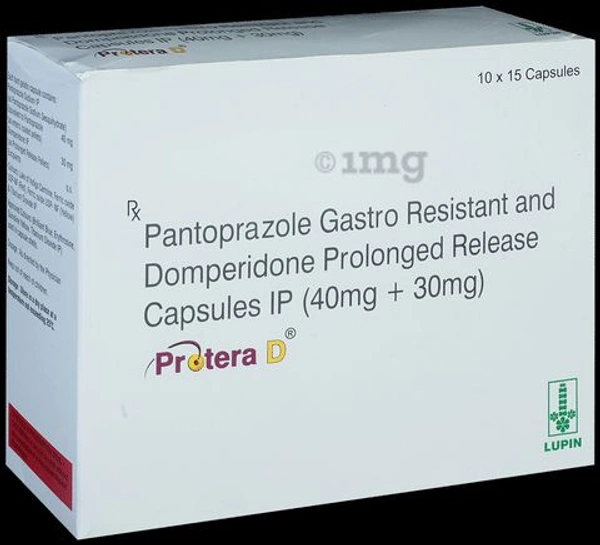 Protera D Capsule is a combination of two medicines: Domperidone and Pantoprazole. This combination is used to treat acidity, heartburn or Gastroesophageal Reflux Disease (GERD); a condition where the acid in the stomach flows back up into the food pipe (esophagus). It is also used to treat gastric and duodenal ulcers.