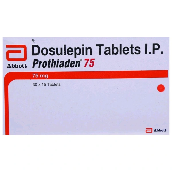Prothiaden 75 Tablet is used to treat depression that is unresponsive to other antidepressants or any other alternative treatment. It is also used to treat disorders related to anxiety. It contains Dosulepin, which works by increasing the levels of chemical messengers which are responsible for stabilizing and elevating the mood levels in the brain. It also stops your brain from releasing the chemicals which cause anxiety. It provides relief from symptoms such as feelings of restlessness, irritability, tiredness, difficulty concentrating, feeling, and sleep disturbances. It helps to carry out daily activities easily. In some cases, you may experience increased heart rate, blurred vision, dizziness, dryness in the mouth and constipation. Before taking this medicine, you should tell your doctor if you are allergic to any of its components or if you are pregnant/breastfeeding, and about all the medications you are taking and pre-existing medical conditions.