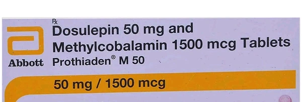 Prothiaden M 50 Tablet is used in the treatment of depression. It contains Dosulepine and Methylcobalamin, which increase neurotransmitter (serotonin and noradrenaline) activity in the brain that regulates mood, memory, and the ability to concentrate. It may cause common side effects, such as dry mouth, blurred vision, headache, increased or decreased appetite, nausea or vomiting, diarrhoea, changes in heartbeat, constipation, difficulty urinating, and sweating. Before taking this medicine, you should tell your doctor if you are allergic to any of its components or if you are pregnant/breastfeeding, and about all the medications you are taking and pre-existing medical conditions.