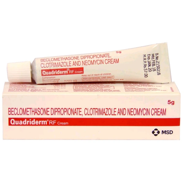 Quadriderm RF Cream 5 gm is used to treat various fungal and bacterial skin infections. It treats skin inflammation due to allergies or irritants, eczema (inflamed, itchy, cracked and rough skin patches), psoriasis (skin cells multiply rapidly to form bumpy red patches covered with white scales), ringworm, athlete's foot (fungal infection between the toes), jock itch (fungal infection in the skin of the genitals, inner thighs and buttocks), insect bites, and stings. It stops the growth of fungi and bacteria. Also, it blocks the production of prostaglandins (chemical messengers) that make the affected area red, swollen and itchy. It may cause common side effects such as burning, irritation, itching and redness at the application site.