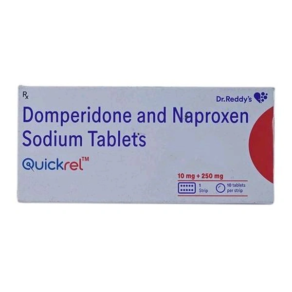 Quickrel 10MG+250MG Tablet is used to treat migraine headaches. Additionally, it can also be used to alleviate pain associated with rheumatoid arthritis, gout, and dysmenorrhea (menstrual pain). It contains Naproxen and Domperidone, which work by reducing certain chemical substances (prostaglandins) that cause pain and swelling. Also, it prevents nausea and vomiting symptoms by blocking certain receptors (like dopamine and serotonin) that stimulate the vomiting centre in the brain. It may cause common side effects, such as dry mouth, abdominal pain, constipation, drowsiness, dizziness, visual disturbances, hearing problems, and headache. Before taking this medicine, you should tell your doctor if you are allergic to any of its components or if you are pregnant/breastfeeding, and about all the medications you are taking and pre-existing medical conditions.