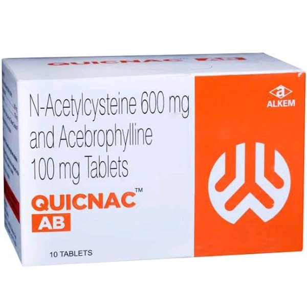 Quicnac AB Tablet is used to prevent and treat symptoms of chronic obstructive pulmonary disease (COPD) such as shortness of breath, coughing, or wheezing (whistling sound while breathing). It contains Acebrophylline and Acetylcysteine, which works by relaxing muscles and widening the airways of the lungs. Also, it thins and loosens phlegm (mucus) in the lungs, windpipe, and nose. Thus, it helps to cough out easily and makes breathing easier by opening airways. Some people may experience diarrhoea, nausea, vomiting, runny nose, dizziness, heartburn, stomach pain, skin rash, drowsiness, and cool and moist skin. Before taking this medicine, you should tell your doctor if you are allergic to any of its components or if you are pregnant/breastfeeding, and about all the medications you are taking and pre-existing medical conditions.