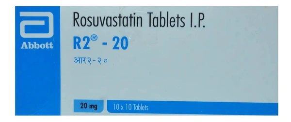R2 20 Tablet is used in the treatment of high cholesterol and to reduce the risk of stroke and heart attack. It contains Rosuvastatin, which slows down cholesterol production in the body and decreases the amount of cholesterol that may build up on the arteries walls and block blood flow to brain, heart and other body parts. Thus, it lowers cholesterol and fats levels and helps to prevent stroke, heart disease and heart attack. It may cause side effects such as myalgia (muscle pain), asthenia (lack of energy), nausea, headache, abdominal pain, muscle pain, weakness, and daytime drowsiness. Before taking this medicine, you should tell your doctor if you are allergic to any of its components or if you are pregnant/breastfeeding, and about all the medications you are taking and pre-existing medical conditions.