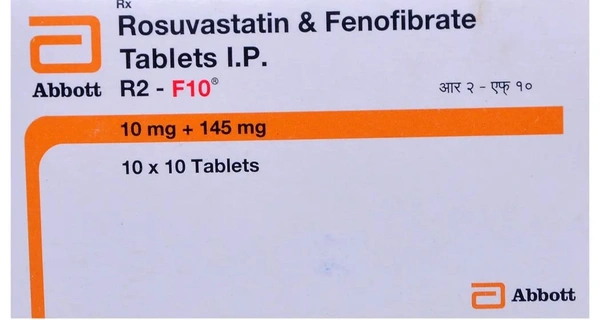 R2-F10 Tablet is used to lower an increased level of total cholesterol (TC) and triglyceride (TG) level. This prevents the risk of having any cardiovascular events like heart attack, stroke, and heart-related chest pain (angina) in the future. It contains Rosuvastatin and Fenofibrate, which lowers the levels of raised lipids known as cholesterol and triglycerides in the blood and increases the good cholesterol (HDL) by blocking body's production of bad cholesterol. It also improves your body's ability to remove it from your blood. In some cases, you may experience side effects such as nausea, headache, abdominal pain, muscle pain, weakness, and daytime drowsiness