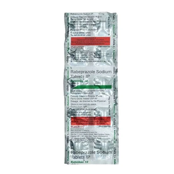 Rabemac 10 mg Tablet is used to treat duodenal ulcers, gastro-oesophageal reflux disease (reflux of gastric contents into the oesophagus), heartburn, erosive oesophagitis (acid-related damage to the lining of the oesophagus), infections caused by Helicobacter pylori when given along with an antibiotic, and Zollinger-Ellison syndrome. It contains Rabeprazole, which reduces acid production, heals the ulcers and prevents the formation of new ulcers. In some cases, you may experience certain common side effects such as headache, dizziness, diarrhoea, constipation, nausea, vomiting, flatulence (wind), weakness, and runny nose. Before taking this medicine, you should tell your doctor if you are allergic to any of its components or if you are pregnant/breastfeeding, and about all the medications you are taking and pre-existing medical conditions