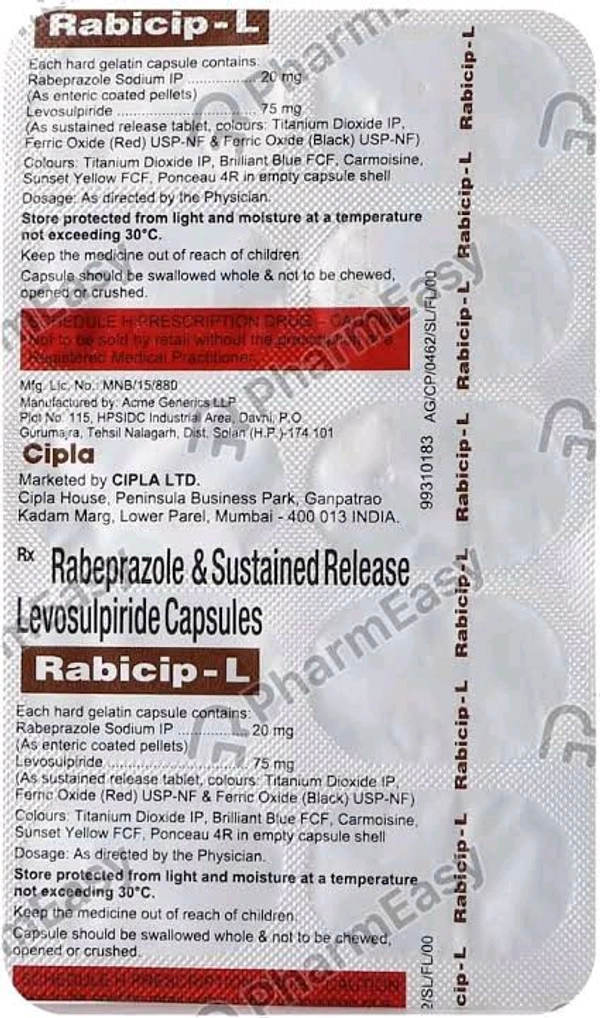 Rabicip-L Capsule SR is a prescription medicine which is used in the treatment of gastroesophageal reflux disease (acid reflux), intestinal ulcers, and irritable bowel syndrome. It reduces excess acid production in the stomach and prevents the reflux of stomach acid into the food pipe.