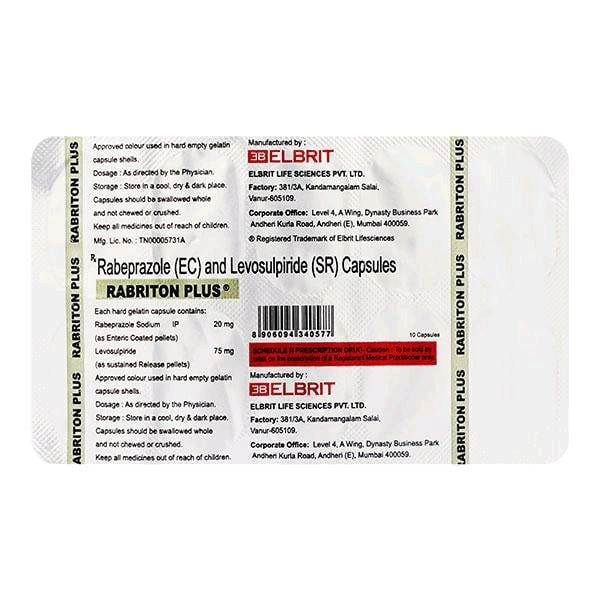 Rabriton Plus 75mg/20mg Capsule SR is a prescription medicine which is used in the treatment of gastroesophageal reflux disease (acid reflux), intestinal ulcers, and irritable bowel syndrome. It reduces excess acid production in the stomach and prevents the reflux of stomach acid into the food pipe.