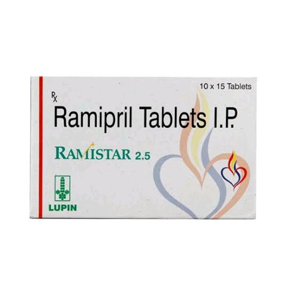 Ramistar 2.5 Tablet is used to treat high blood pressure (hypertension) and reduce the risk of having a heart attack, stroke or heart failure. It contains Ramipril, which relaxes and widens the blood vessels, making it easier for the heart to pump blood to all parts of the body, thereby lowering the raised blood pressure and reducing the risk of having a heart attack, stroke or heart failure. In some cases, it may cause common side effects like headache, dizziness, fatigue, and cough. Before taking this medicine, you should tell your doctor if you are allergic to any of its components or if you are pregnant/breastfeeding, and about all the medications you are taking and pre-existing medical conditions