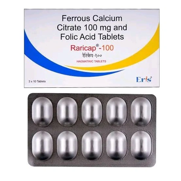 Raricap 100 Tablet is used to treat anaemia (deficiency of iron and haemoglobin). Its deficiency occurs mainly due to poor diet, poor absorption of food or increased folate use in the body (in pregnancy). It contains Iron and Folic acid, which work by boosting the production of red blood cells (RBC) in the body.