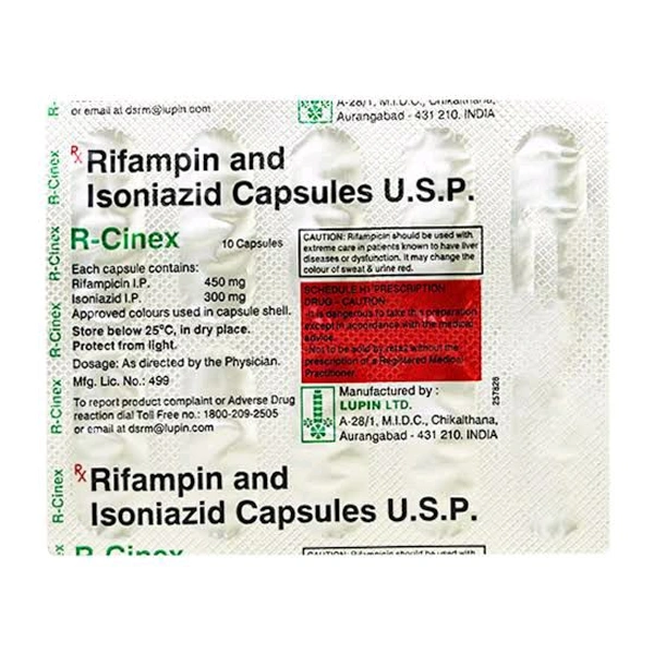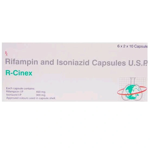 , thereby helping treat tuberculosis, an infection caused by the bacterium. R Cinex 450mg Capsule is a combination of Rifampicin and Isoniazid. It is also used to treat other forms of tuberculosis caused by the bacterium apart from pulmonary, i.e., lung tuberculosis. Together, these two antibiotics destroy the bacteria Mycobacterium tuberculosis, and thus, the infection is eliminated. You may experience some side effects associated with the consumption of R Cinex 450mg Capsule, including nausea, vomiting, headache, heartburn, etc. However, they usually subside with time. Avoid alcohol while on treatment with R Cinex 450 mg Capsule because it might result in excess drowsiness. You should take R Cinex 450mg Capsule on an empty stomach. Abrupt discontinuation could increase the risk of infection recurrence. Results may take some time to appear, so check with your doctor if symptoms are aggravated or if you do not notice any improvement in your condition.