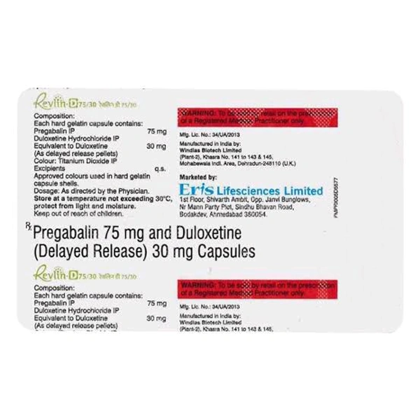 Revlin.D 75/30 Capsule DR is used for the treatment of neuropathic pain. It decreases pain by controlling calcium channel activity of the nerve cells. It also increases the level of chemical messengers in the brain that helps maintain mental balance and stop the movement of pain signals in the brain.