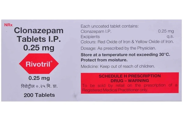 Rivotril 0.25 mg Tablet is used to treat seizures or fits due to epilepsy, panic disorder and involuntary muscle spasms. It may also be used to treat restless leg syndrome. It contains clonazepam, which works by increasing the level of a calming chemical in the brain. This helps relieve anxiety and seizures (fits). It also helps relax the tense muscles. Thereby, it aids in the treatment of seizures, panic disorder, and involuntary muscle spasms. In some cases, it may cause side effects such as drowsiness, dizziness, fatigue, and problems with memory, walking, and coordination. Before taking this medicine, you should tell your doctor if you are allergic to any of its components or if you are pregnant/breastfeeding, and about all the medications you are taking and pre-existing medical conditions.