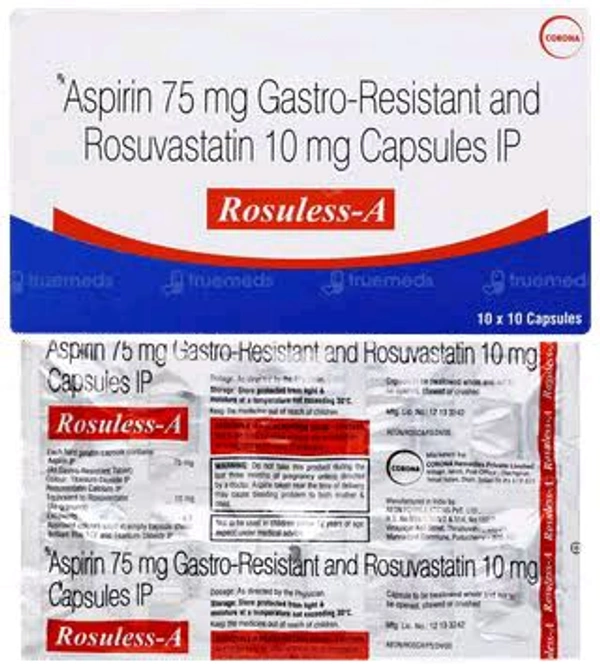 Rosuless-A Capsule is a combination of two medicines used to prevent heart attack, stroke, and angina. This medicine reduces the "bad" cholesterol (LDL) and triglycerides (fats) levels. Moreover, it also decreases the formation of blood clots