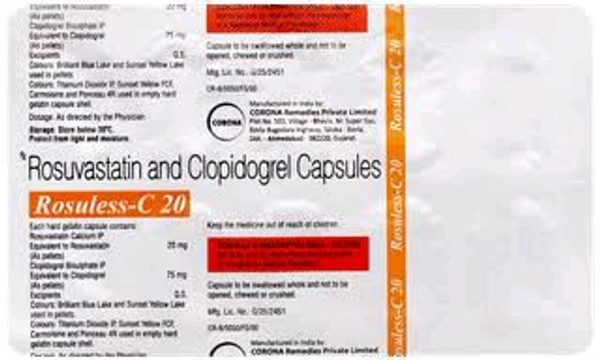 Rosuless-C 20 uses are primarily for preventing heart attacks, strokes, and angina (chest pain) by lowering "bad" (LDL) cholesterol, triglycerides, and preventing blood clots. It is also used to slow the progression of atherosclerosis and manage mixed dyslipidemia. The combination of its active ingredients works to lower cholesterol and keep platelets from clumping together.