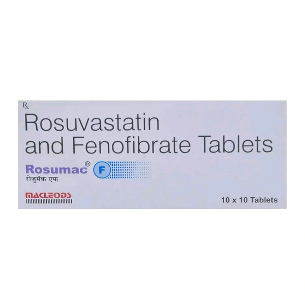 Rosumac F Tablet is used to lower an increased level of total cholesterol (TC) and triglyceride (TG) level. This prevents the risk of having any cardiovascular events like heart attack, stroke, and heart-related chest pain (angina) in the future. It contains Rosuvastatin and Fenofibrate, which lowers the levels of raised lipids known as cholesterol and triglycerides in the blood and increases the good cholesterol (HDL) by blocking body's production of bad cholesterol. It also improves your body's ability to remove it from your blood. In some cases, you may experience side effects such as nausea, headache, abdominal pain, muscle pain, weakness, and daytime drowsiness