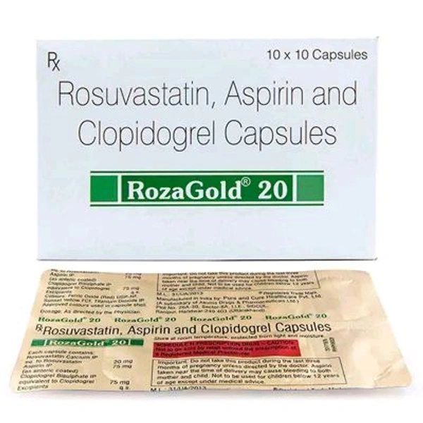 Rozagold 20 Capsule is used for prevention of heart attack. It is a combination of medicines that prevents clot formation in the blood vessels. It also helps to reduce increased cholesterol and triglycerides levels. This medicine should be taken with food regularly at a fixed time each day.
