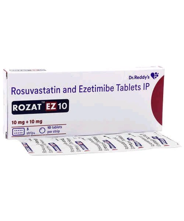 Rozat EZ 10 Tablet is a combination medication containing Rosuvastatin (10 mg) and Ezetimibe (10 mg), primarily used to treat high cholesterol (hyperlipidemia) and prevent cardiovascular events like heart attacks and strokes. It works by reducing the liver's production of cholesterol and blocking its absorption in the intestines.