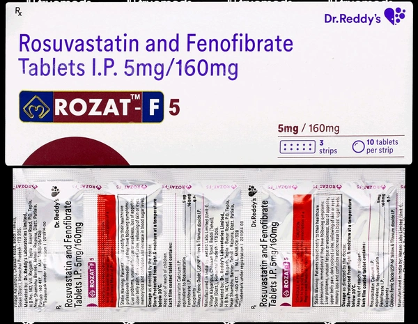 Rozat-F 5 tablet is a combination medicine, comprising Rosuvastatin and Fenofibrate, used primarily to manage high cholesterol and triglyceride levels. It is used to help reduce the risk of cardiovascular events in patients with specific lipid profiles, such as mixed dyslipidemia.