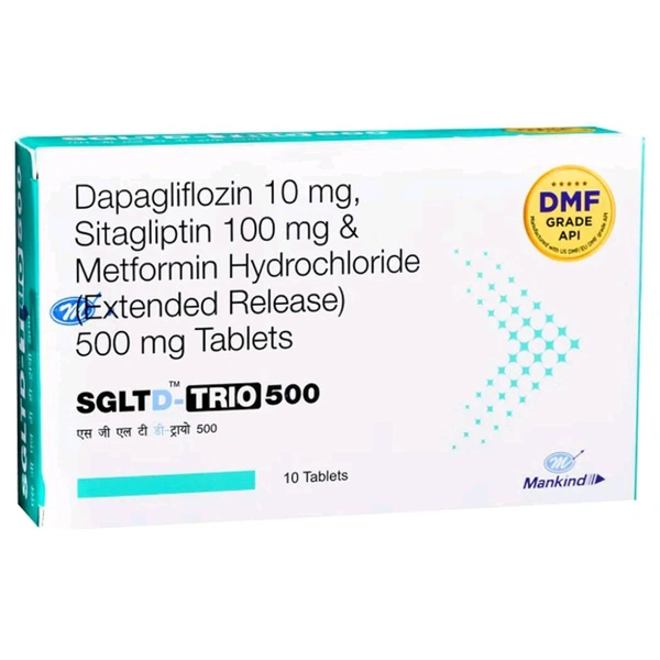 Sgltd-Trio 500 Tablet is an antidiabetic medicine used to treat Type II Diabetes adjunct to diet and exercise. It contains Dapagliflozin (which removes excess sugar from the body via urine), Sitagliptin (which works by increasing the amounts of certain natural substances that lower blood sugar when it is high) and Metformin (which works by reducing the sugar production by cells in the liver and delays sugar absorption from the intestines).